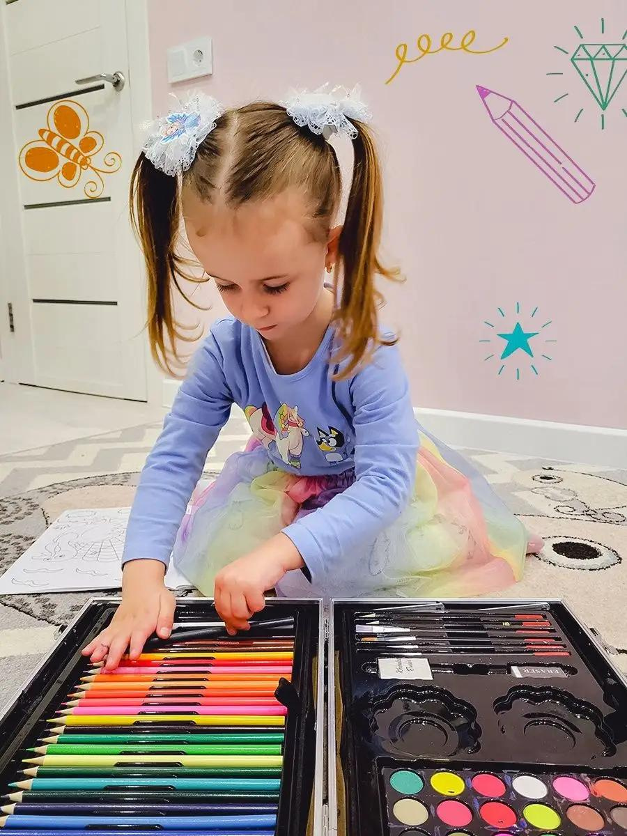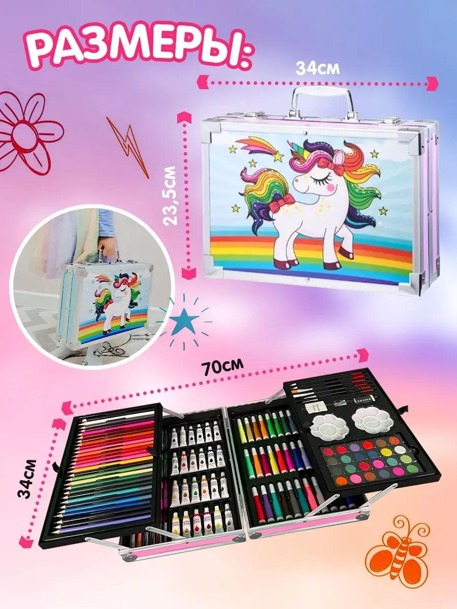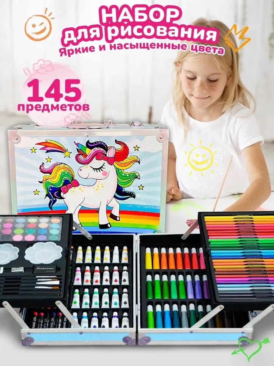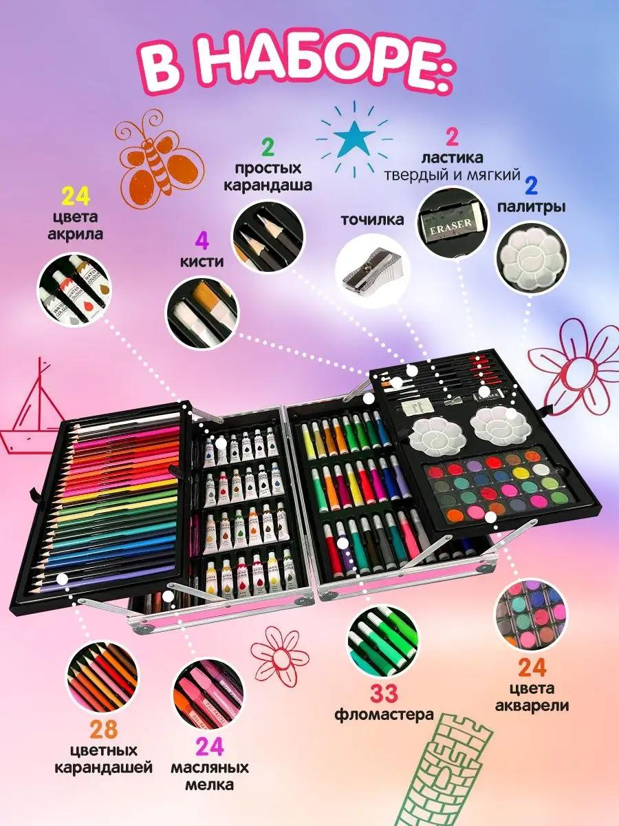 Набор для творчества в чемоданчике отличный подарок для девочки и мальчика, школьника и всех кто увлекается творчеством. Это уникальный набор для рисования и творчества, в котором собрано 145 предметов. Набор позволит Вашему ребенку развить мелкую моторику, внимательность и усидчивость. Все предметы собраны в компактном чемодане, каждый имеет свое место и прочно крепится на него, все предметы качественные и безопасные. Чемодан раскладывается как книга, имеет два выдвижных яруса.